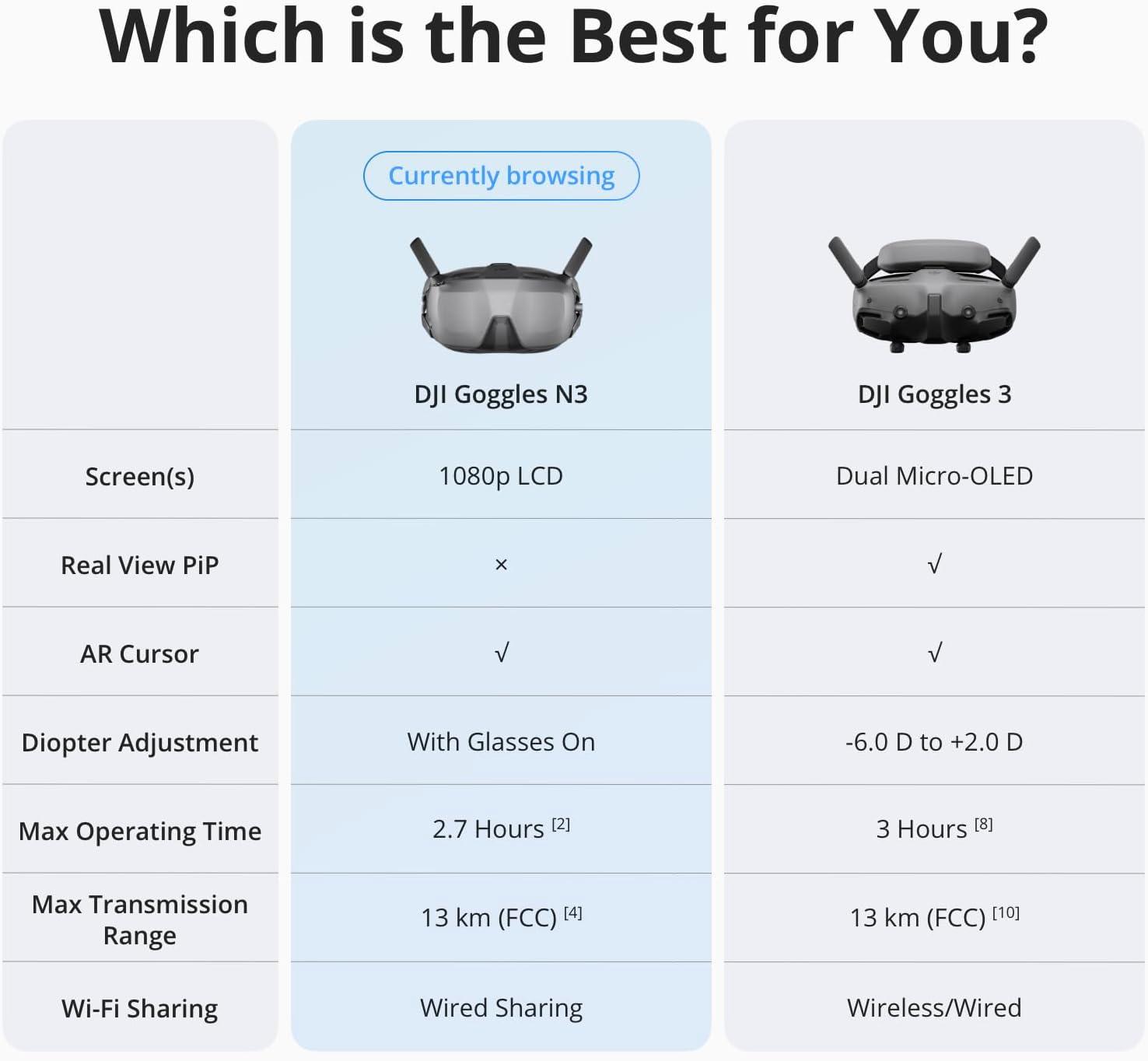 Experience thrilling and immersive flight with DJI Goggles N3. Featuring a 1080p ultra-wide screen, DJI O4 video transmission, a 2.7-hour max operating time, [2] and so much more, they offer seamless control and stunning visuals. Enjoy a comfortable fit, one-tap defogging, and real-time live feed sharing.
