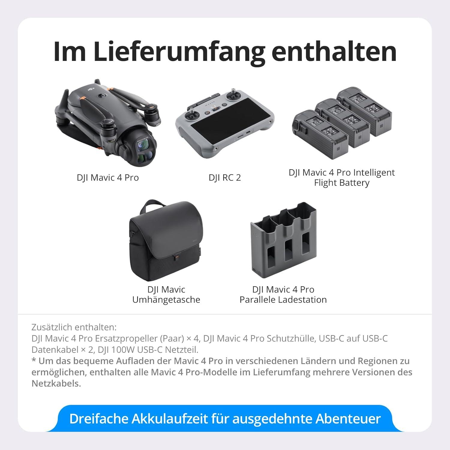 – DJI Mavic 4 Pro (DJI RC 2) includes DJI Mavic 4 Pro, DJI RC 2, one battery, 100W USB-C Power Adapter, and more to get you started.