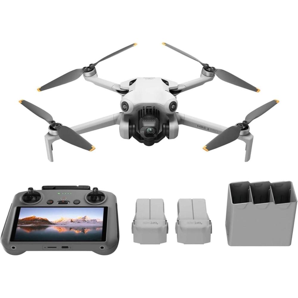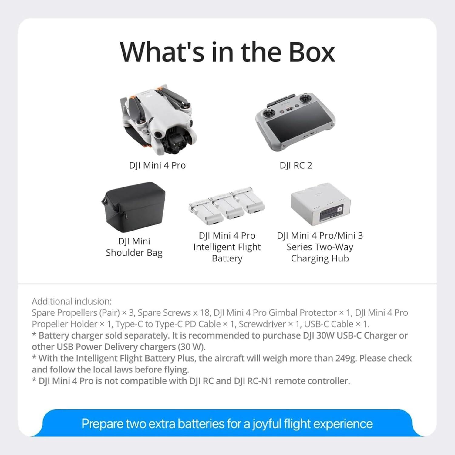 -DJI Mini 4 Pro (DJI RC 2) includes the drone, DJI RC 2 remote controller, one DJI Mini 4 Pro Intelligent Flight Battery, and more. Get precision control with DJI RC 2 featuring a bright screen.