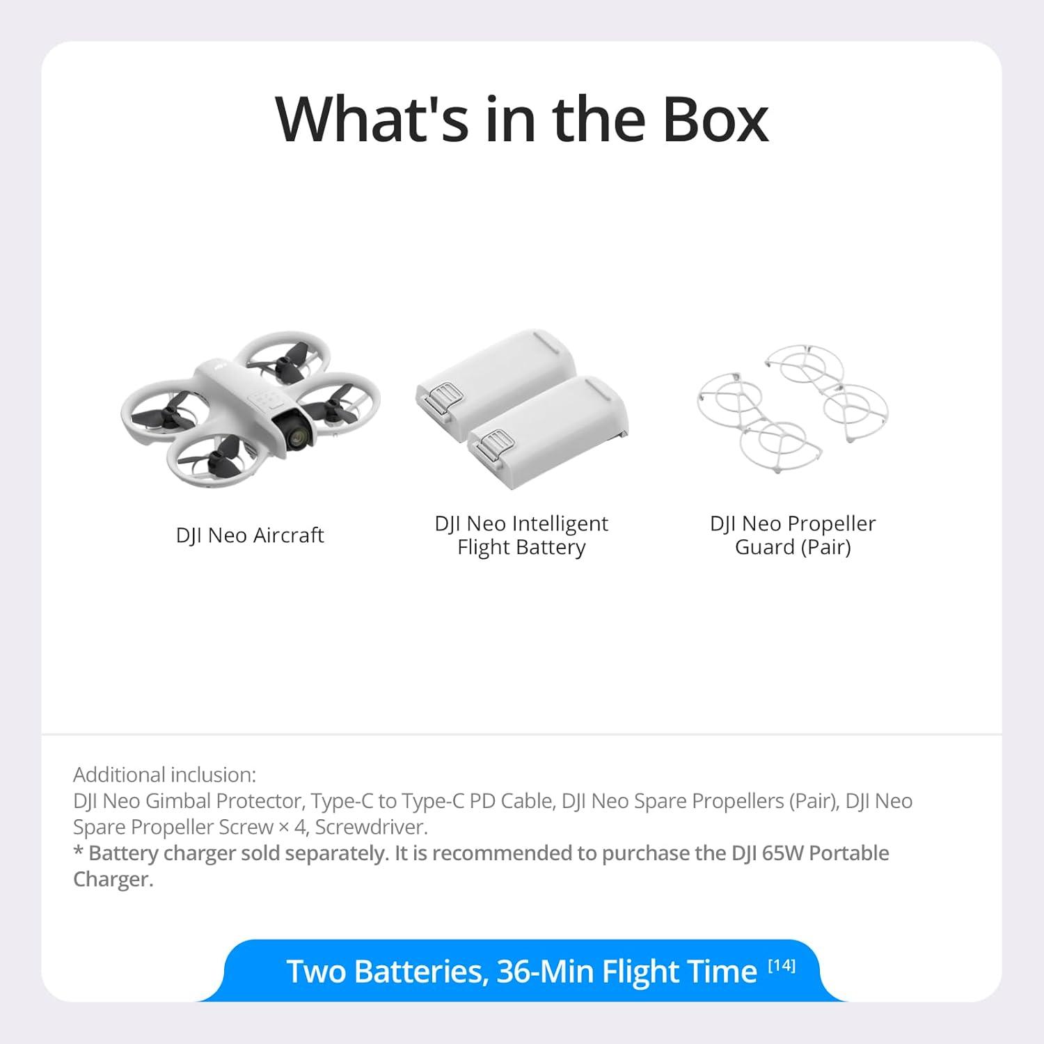 Extend your flights to 36 minutes. The DJI Neo Two-Battery Combo Includes DJI Neo, 2 Batteries, Propeller Guards, and more.