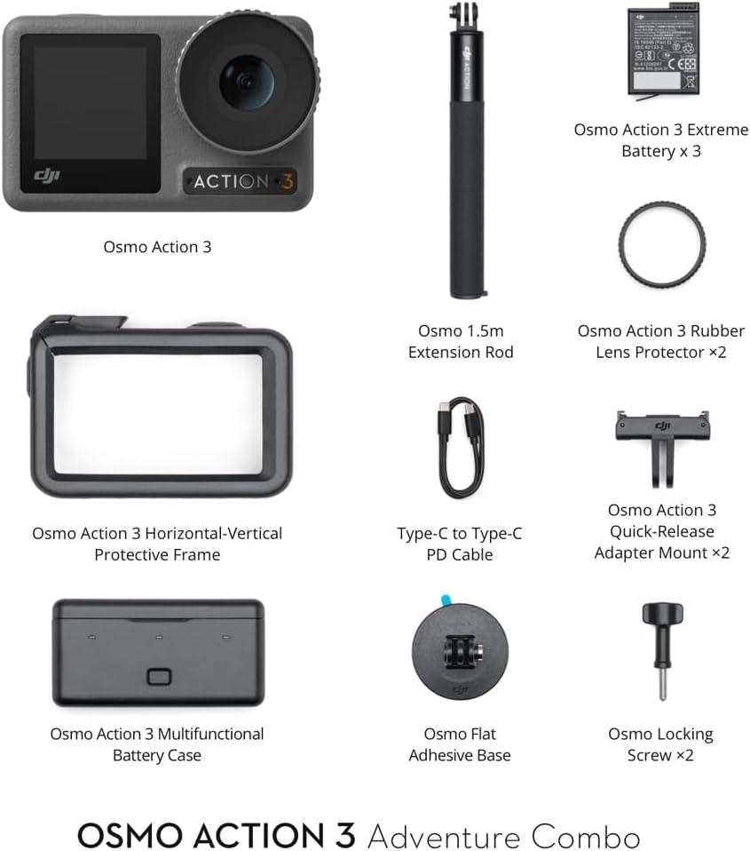 Osmo Action 3 Adventure Combo – Includes everything in the standard combo as well as a multifunctional battery case, extra batteries, and a 1.5m extension rod for unlimited adventure.