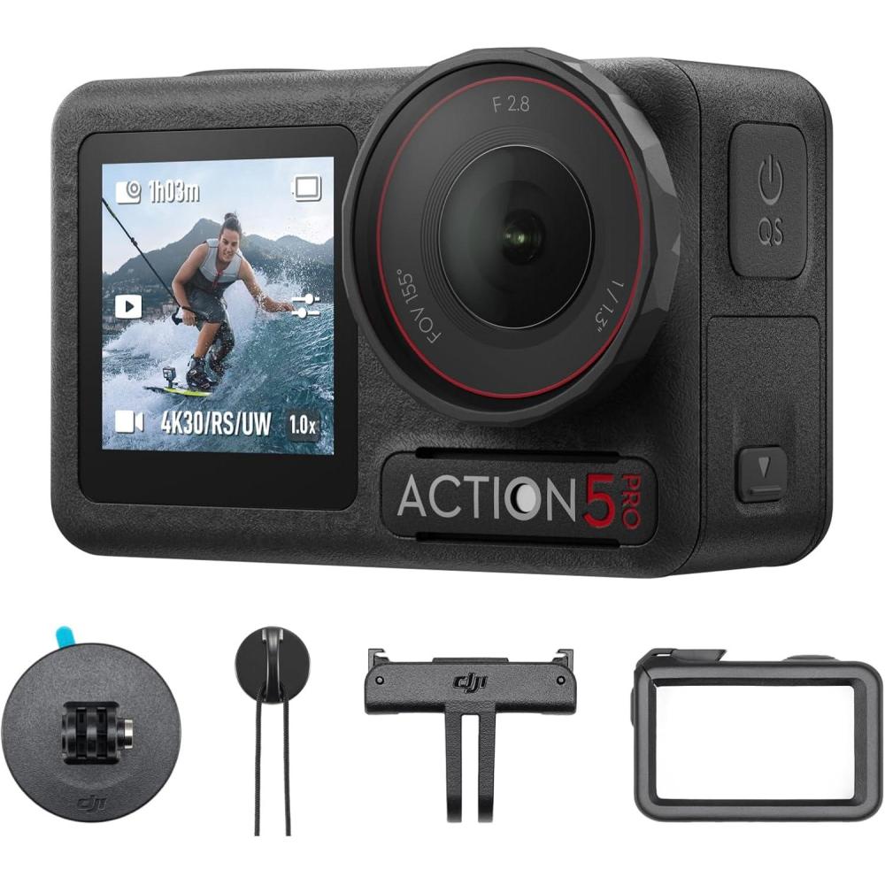 Osmo Action 5 Pro × 1 Osmo Action Extreme Battery Plus (1950 mAh) × 1 Osmo Action Horizontal-Vertical Protective Frame × 1 Osmo Action Surfing Tether Kit × 1 Osmo Action Quick-Release Adapter Mount × 1 Osmo Action Curved Adhesive Base × 1 Osmo Locking Screw × 1 Type-C to Type-C PD Cable × 1 Osmo Action 5 Pro Rubber Lens Protector × 1 Osmo Action 5 Pro Glass Lens Cover × 1 Osmo Action Anti-Slip Pad × 1 DJI Logo Sticker × 1