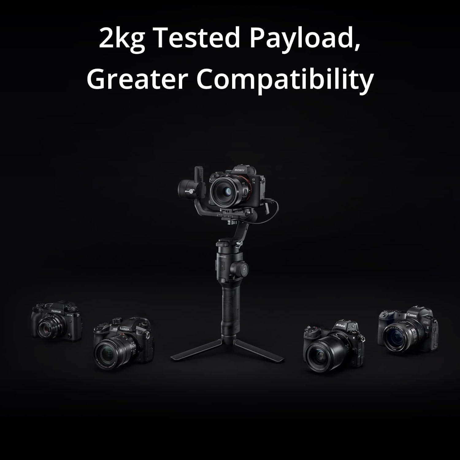 The Ronin-SC stabilizer for mirrorless cameras supports a wide range of cameras and lenses. It has been rigorously tested to support a payload of 4.4 lbs / 2.0 kg while still achieving a smooth, cinematic shot.