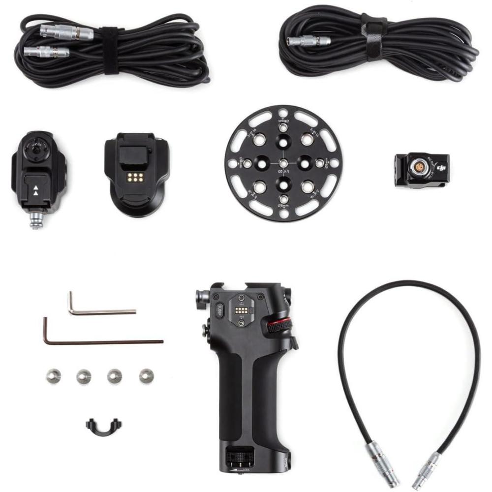 This kit includes a control handle for extended wired control of camera focus and parameters, camera shutter, and gimbal movement.